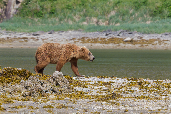 Young coastal brown bear pretty relaxed whilst feeding on grasses right on the shoreline in Geographic Harbor, Alaska.