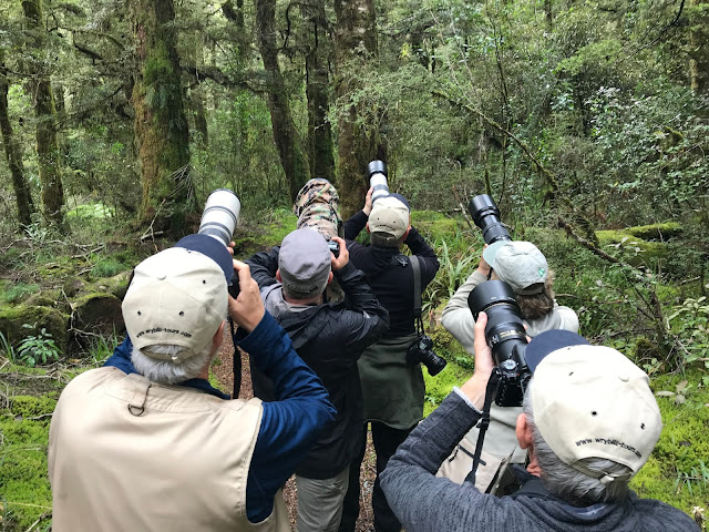 We then carried on, and decided it was time for land, so headed into a little bay to land. We landed and headed into the forest, after spending a little time with the weka of course! There was a lot going on, with fantails, South Island saddlebacks, grey warbler and a tomtit all being seen within a few minutes of landing. Bellbird, tui and NZ pigeon were also around and making noise. We headed to a spot where we had previously had luck with the rare and sometimes difficult orange-fronted parakeet. There were more calls from saddleback, a black morph fantail which was very nice, and more weka. And then a snatch of parakeet call. We waited and watched, and next minute a bird flew right in to full view, landed on a dead branch in the open and sat there for about 25 seconds. Long enough for everyone to get great views and everyone to snap some pictures. It then turned and disappeared into the trees and never looked back. We did hear the odd call over the next 45 minutes, and a brief view of three flying past was had by Cele, but that was it for the parakeet! Pretty happy though.